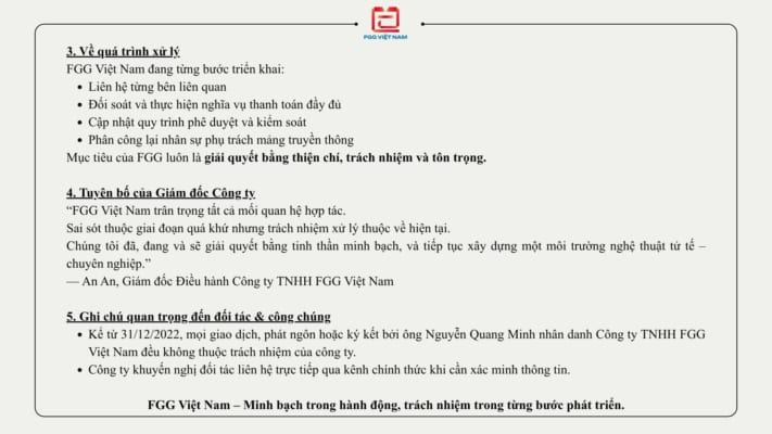 Uncategorized Thông cáo chính thức về việc làm rõ thông tin liên quan đến ông Nguyễn Quang Minh 01 Nov THÔNG CÁO CHÍNH THỨC FGG VIỆT NAM CÔNG BỐ BIỆN PHÁP KHẮC PHỤC SAU SỰ CỐ QUẢN LÝ NỘI BỘ